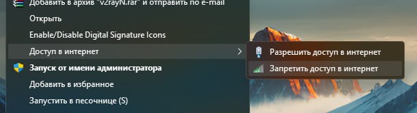 - Для быстрой блокировки любых программ можно использовать утилиту, которая добавит в контекстное меню пункты "Разрешить/запретить доступ в интернет". Скачать можно здесь (распаковать архив и запустить .bat от имени администратора.