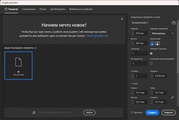 Стартовое окно предусматривает возможность быстрого доступа к ранее открытым проектам, а также кнопку для создания новых. В окошке создания нового проекта верстальщик может задать параметры страницы вручную (ширину и высоту, количество страниц, размеры полей, столбцы и т.д.) или воспользоваться готовыми пресетами (шаблонными настройками).