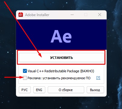 - Появится окно "Adobe Installer", в нем убираем галочку на "Реклама" и устанавливаем на "Visual C++";