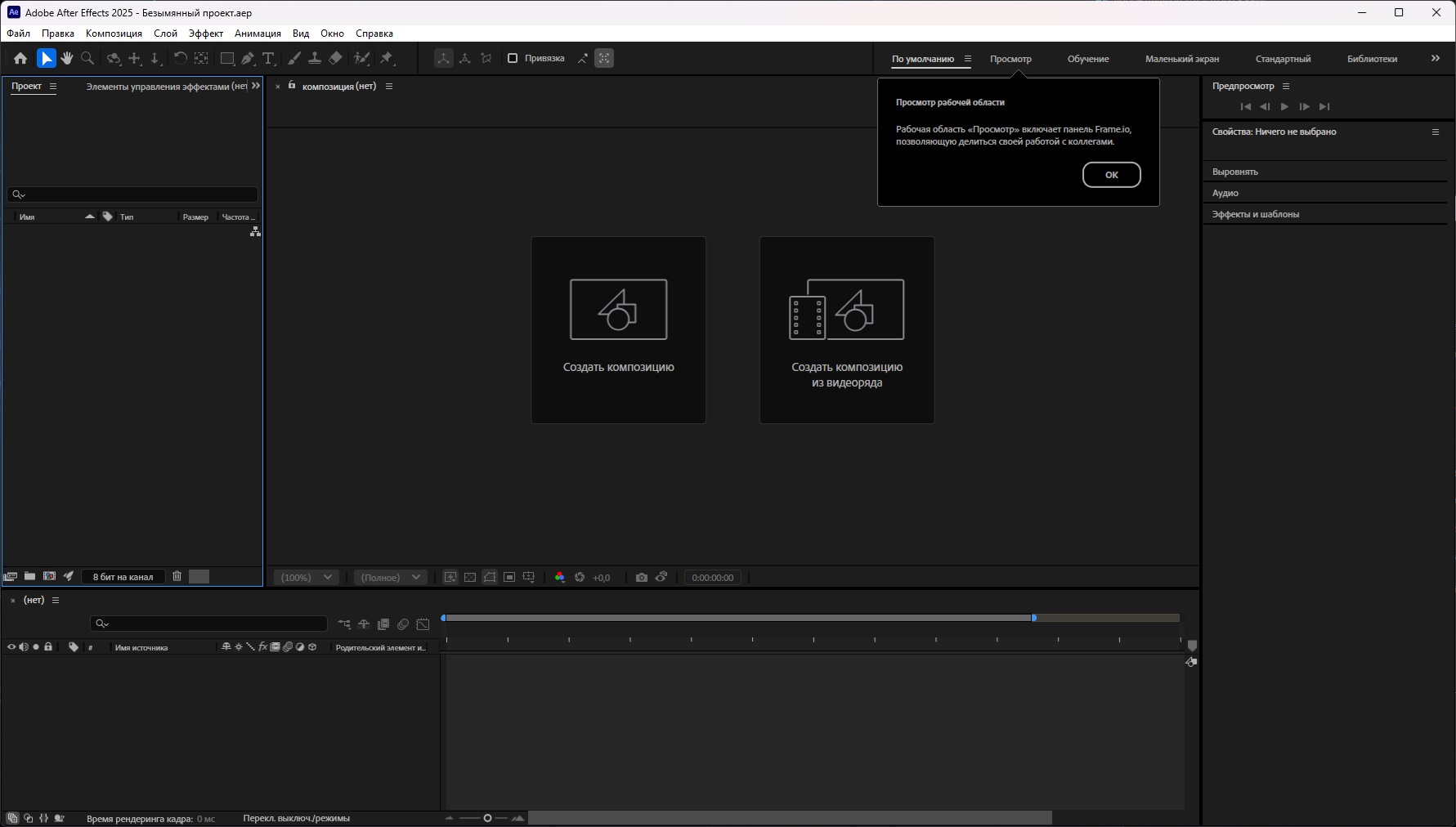 В целях удобства, каждую панель можно скрыть или переместить, в общем настроить интерфейс под свои индивидуальные предпочтения. Стоит отметить, что любая версия After Effects, в т.ч. и 2025, включает перевод на русский язык. Несмотря на это, большинство опытных видеомейкеров советуют изучать программу с английским интерфейсом, т.к. большинство уроков имеющийся в интернете именно на английском. Впрочем, выбирать вам - мне удобнее работать с полной русификацией.