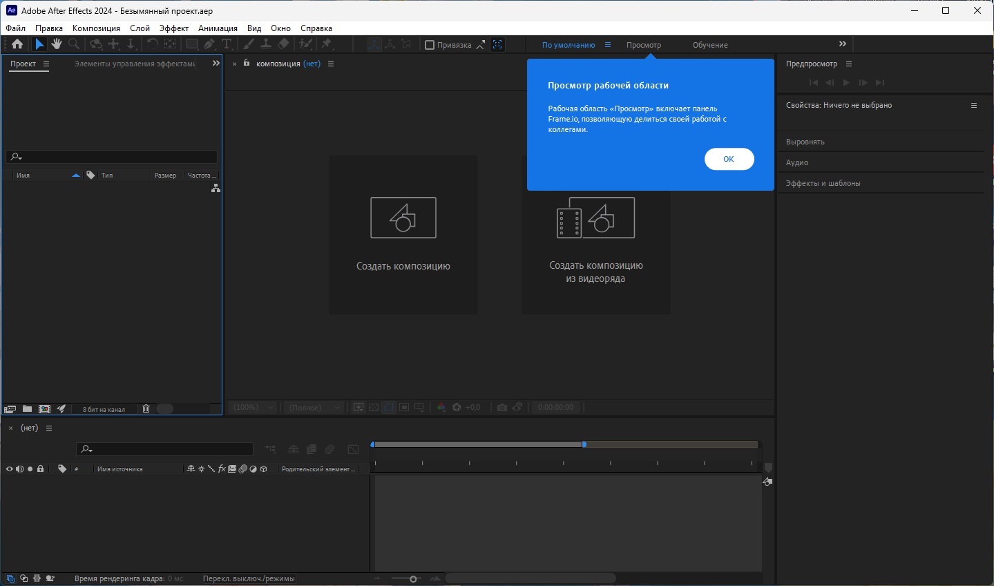 - Нажимаем "ОК" и можем начинать работу в After Effects 2024;