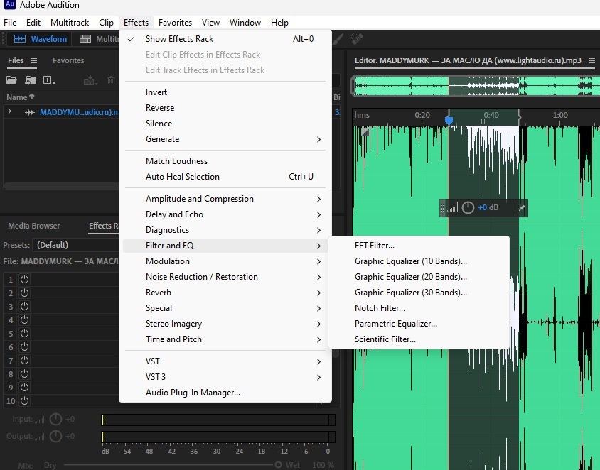 Фильтры и эффекты - вообще отдельная тема для разговора. Без танцев с бубном применяйте плавное затухание или усиление аудио, устраняйте шумы, добавляйте эффекты эха, регулируйте высоту тона. Для обработки и мастеринга предусмотрены эквалайзеры, компрессоры, инструменты восстановления звука и модуляции.